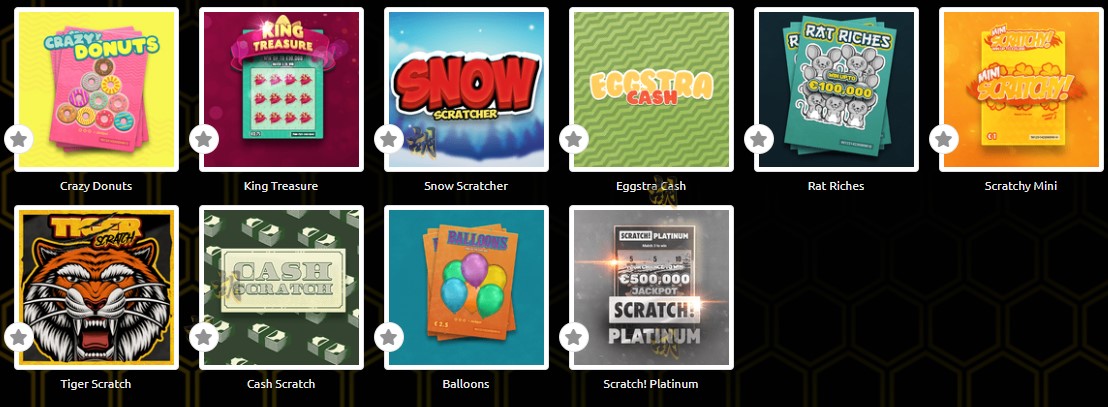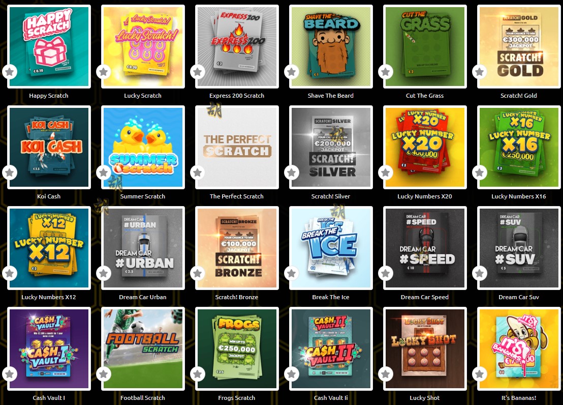 Happy Scratch, Lucky Scratch, Express 200 Scratch, Shave The Beard, Cut The Grass, Scratch! Gold, Koi Cash, Summer Scratch, The Perfect Scratch, Scratch! Silver, Lucky Numbers X20, Lucky Numbers X16, Lucky Numbers X12, Dream Car Urban, Scratch! Bronze, Break The Ice, Dream Car Speed, Dream Car Suv, Cash Vault I, Football Scratch, Frogs Scratch, Cash Vault Ii, Lucky Shot, It's Bananas!, Lucky Numbers X8, Love Is All You Need, Gold Coins, Double Salary - 1 Year, Stack 'em Scratch, Chaos Crew Scratch, Diamond Rush, Ruby Rush, Scratchy Big, Gold Rush, Queen Treasure, Spooky Scary Scratchy, Cash Pool, Scratch’em, Go Panda, Scratchy, Prince Treasure, Shave The Sheep, Crazy Donuts, King Treasure, Snow Scratcher, Eggstra Cash, Rat Riches, Scratchy Mini, Tiger Scratch, Cash Scratch, Scratch! Platinum.